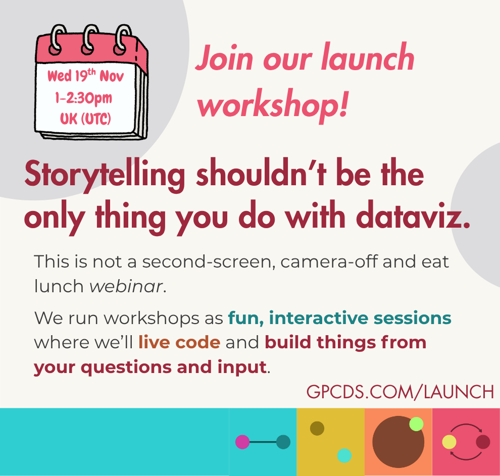 We run workshops as fun, interactive sessions where we’ll do live data/code work and build things from your questions and input.